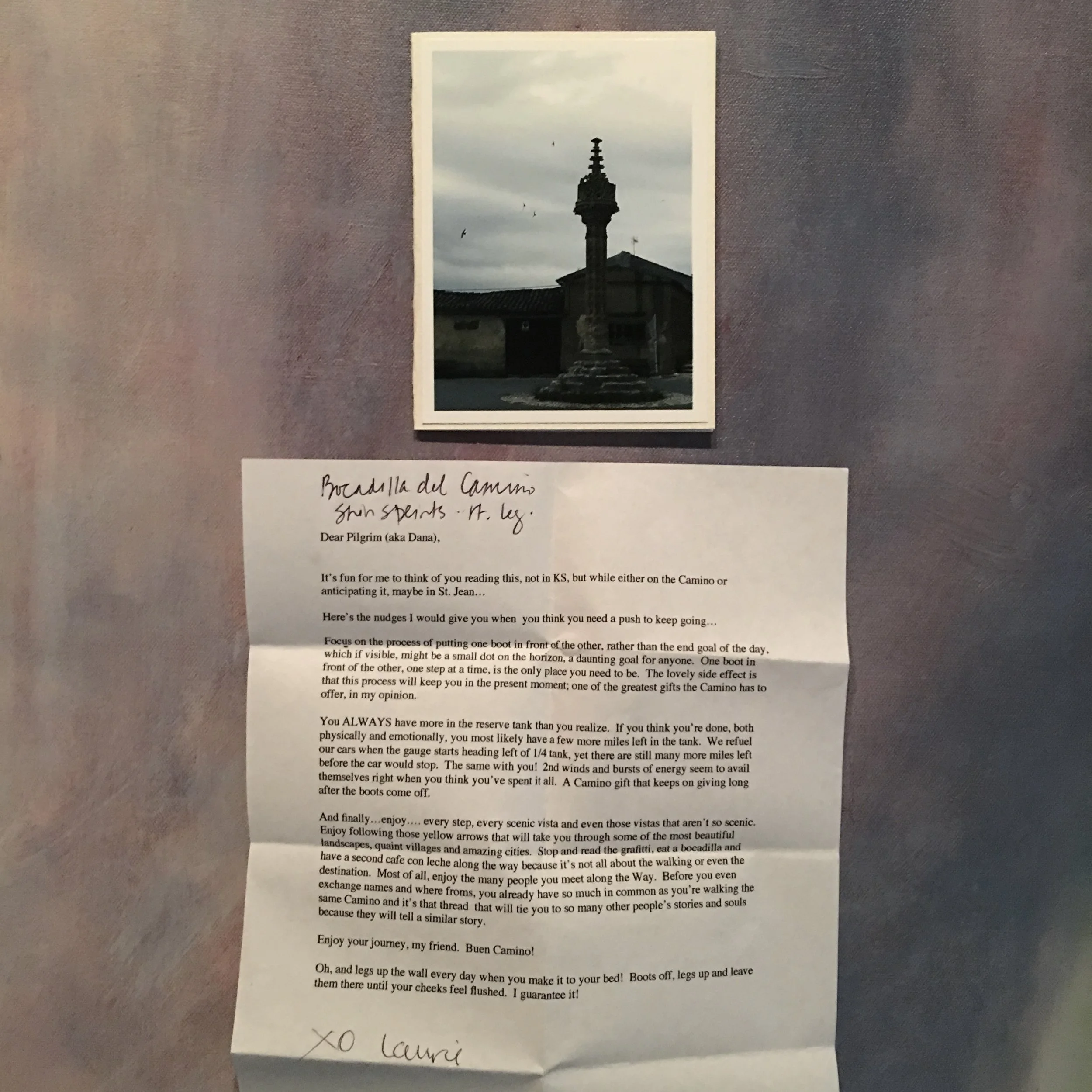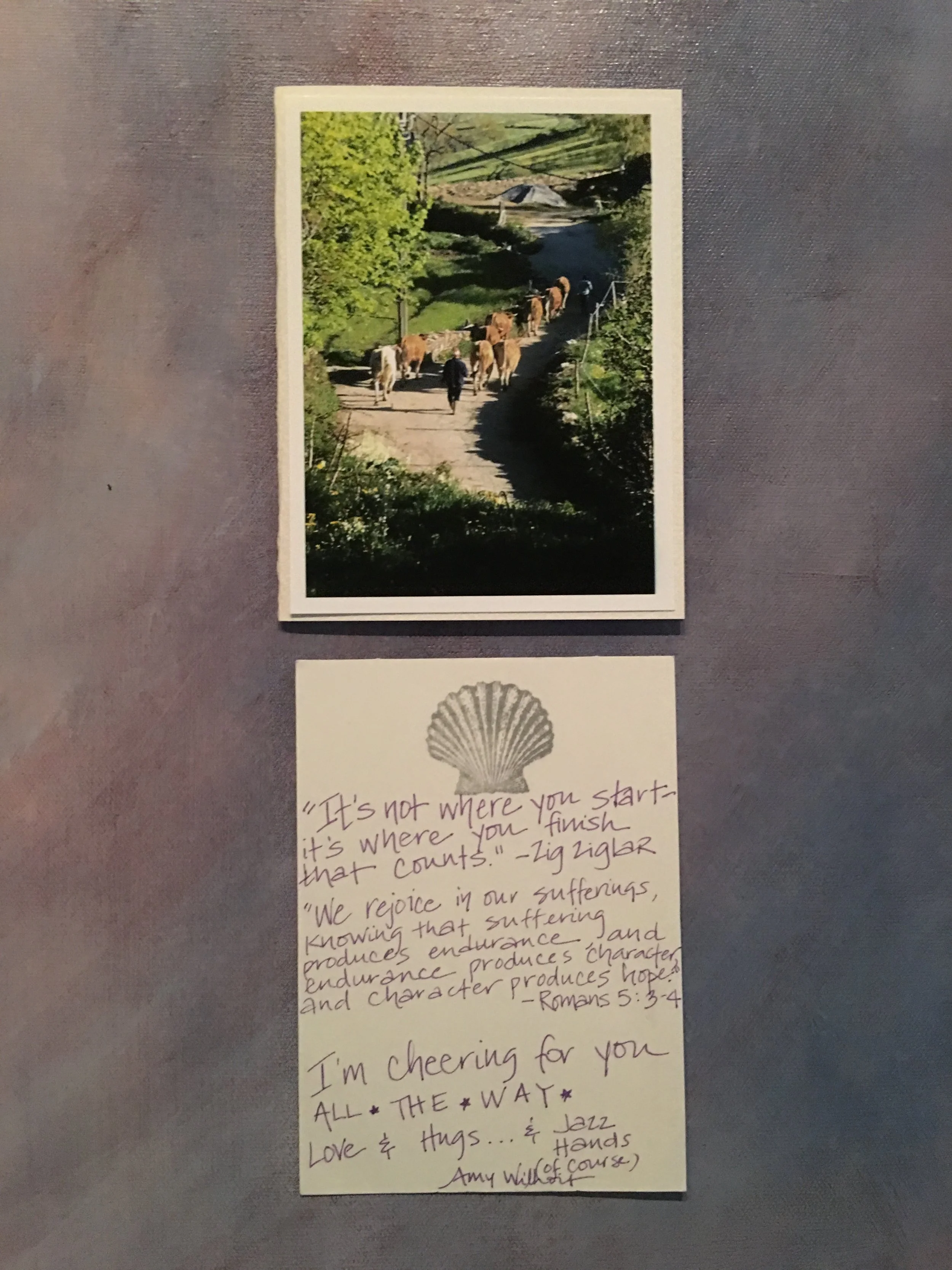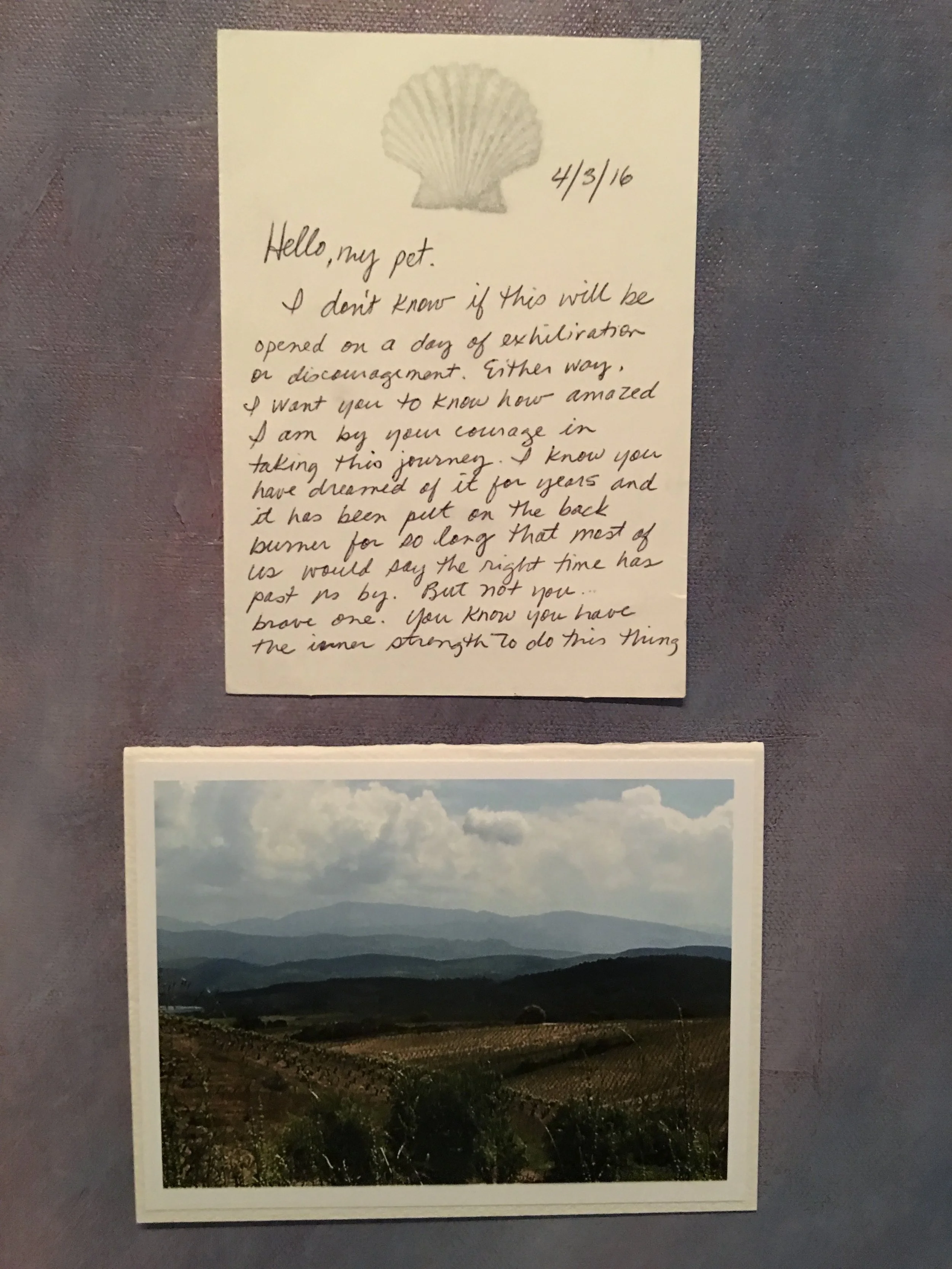Prior to the start of my first Camino de Santiago in the spring of 2016, I sent out a letter to those who had been a part of my life in some capacity from pre-school years to present day. The letter explained the what, where, and why I was walking 500 miles across Spain. I included a blank, scallop-stamped card and a self-addressed, stamped envelope and asked that it be returned, prior to my departure, with words of encouragement or motivation to help me keep putting one foot in front of the other. I received 40 cards back, taking them out of their envelope but keeping them in the order I received them and placed them inside a water-tight baggie to take with me on the walk. I’d planned 42 days for this Camino and I reached Santiago on day 41. On each of those days, I read one note and documented where I was when I read it. Each of the cards was a treasure and the sentiments helped to support me every step of the way. I felt carried and loved, especially on the hardest of days.