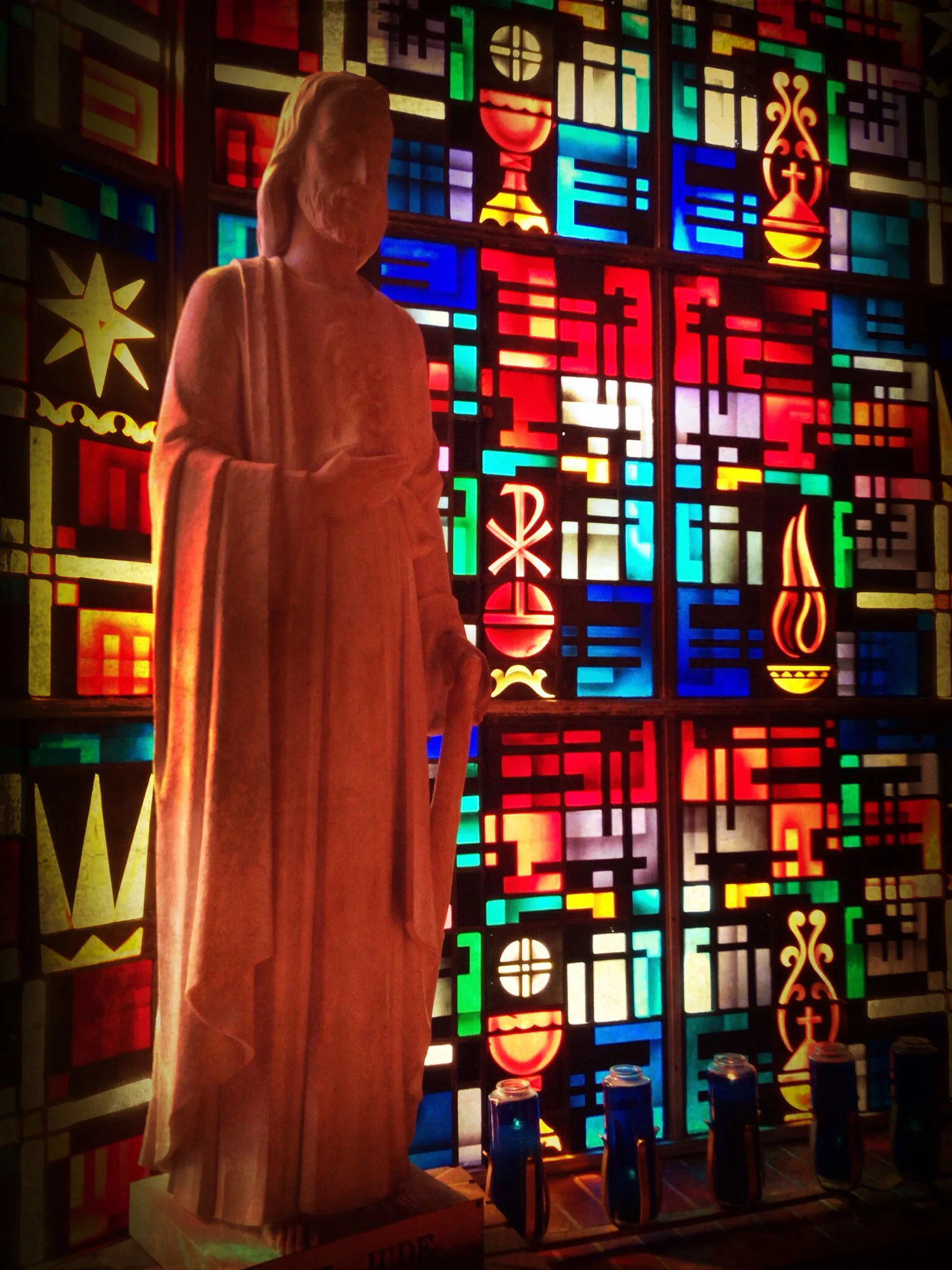 Alone, I prayed. After a while, I stood to take this photo of the beautiful light coming in through the stained glass window. Later, when I looked again at the photo, I could see above the hand of St. Jude, what appeared to the face of Jesus....the miracle maker. Can you see it?