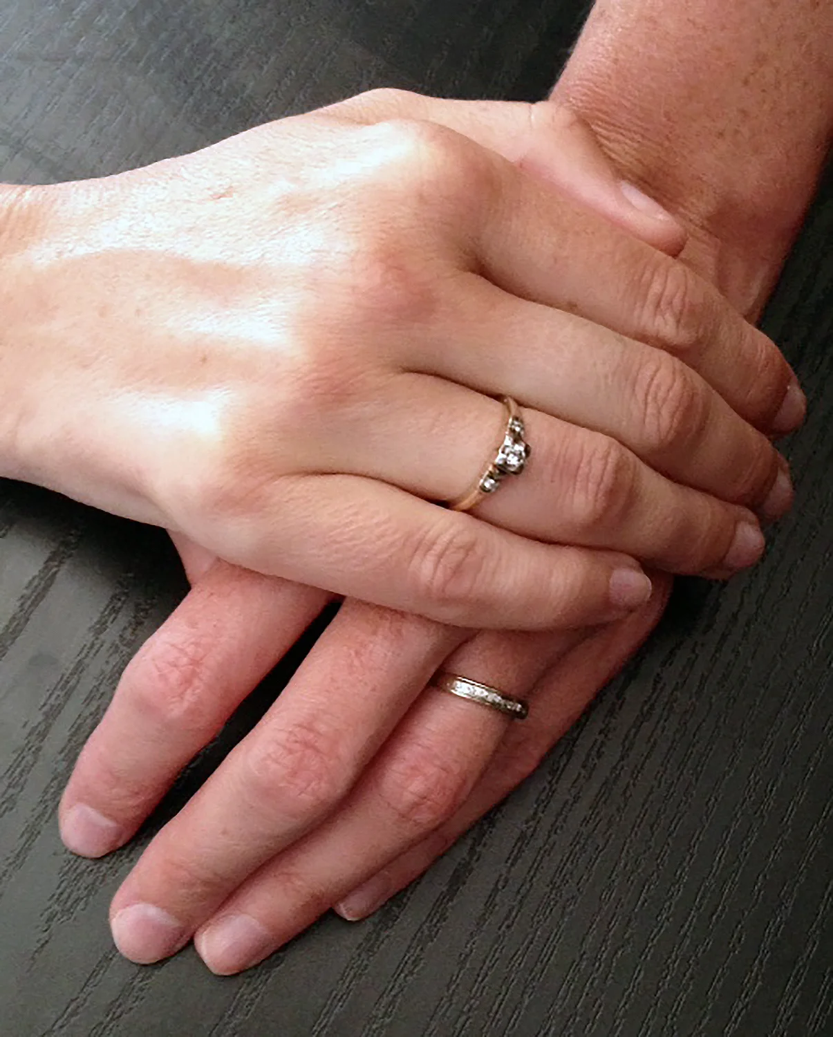 During her life, my mom wore two rings. One was the wedding ring of her mother and one her own. These rings have now been passed down to her granddaughters who wear them in her memory. It's remarkable that a size 4 1/2 and 5 would fit them perfectly. I believe granny would be smiling.
