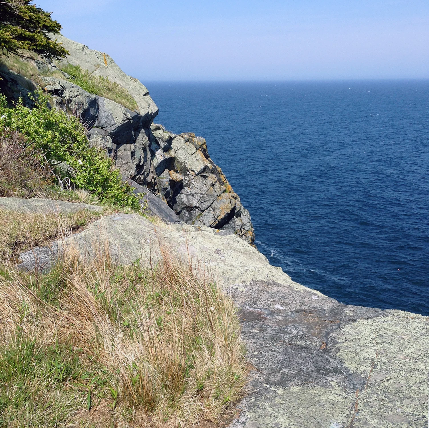 Hiking through forest on Monhegan Island, I finally came to the sea. The cliffs were high, but I climbed down to where I could get a clear view. Looking up, I noticed I was not alone...a stone gorilla was like me....watching.